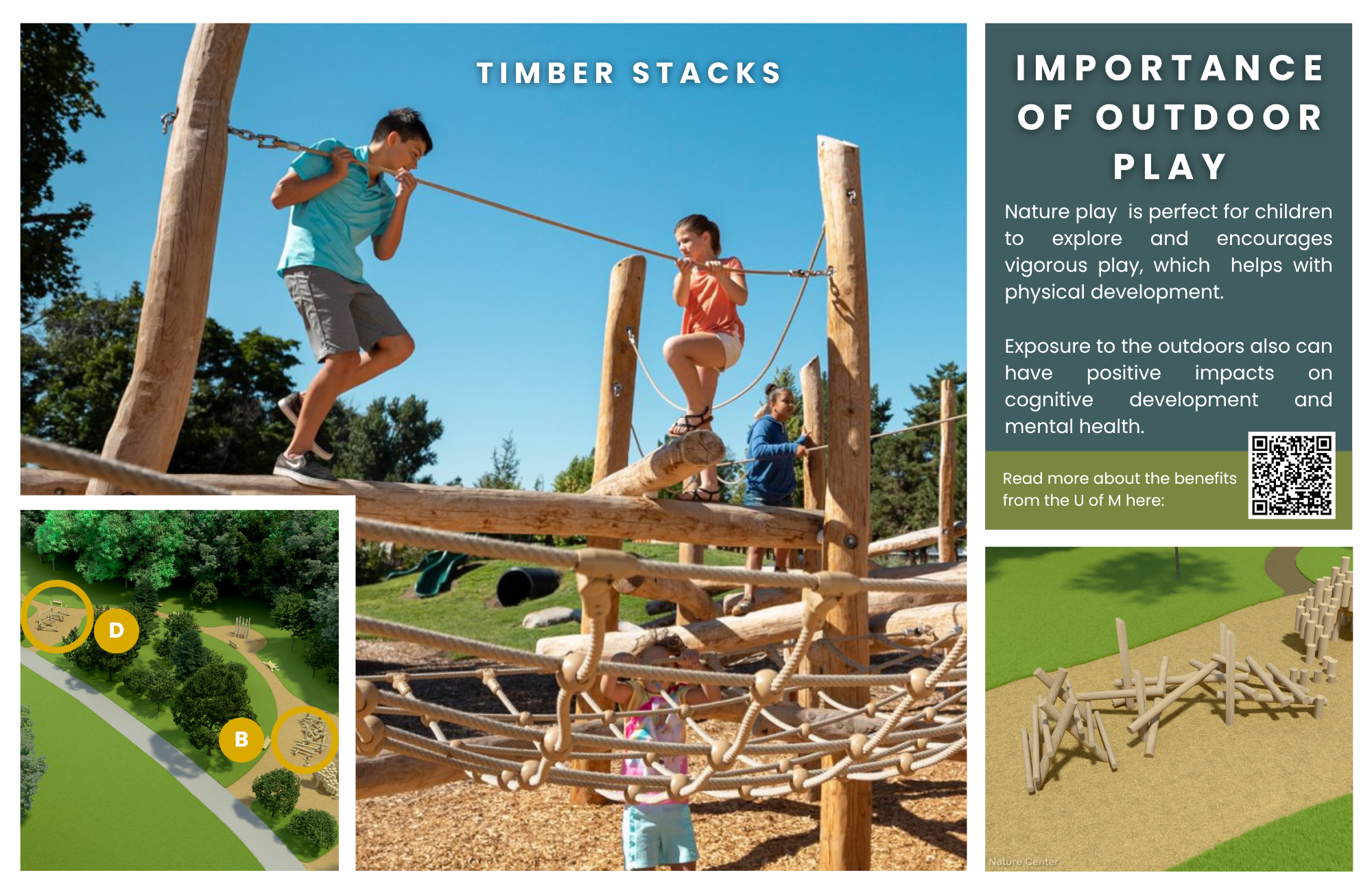 The playground will be professionally designed and installed with appropriate safety standards while still allowing adventurous, nature-based play.