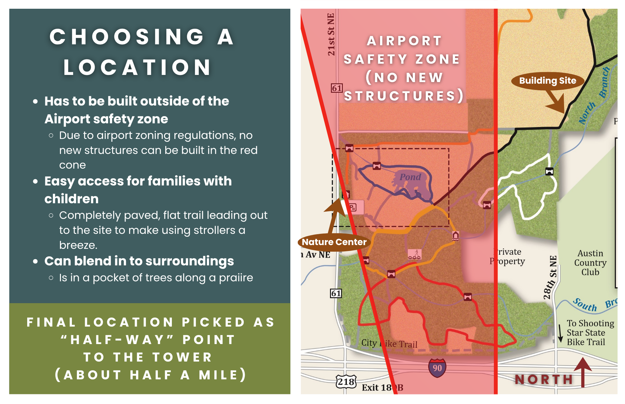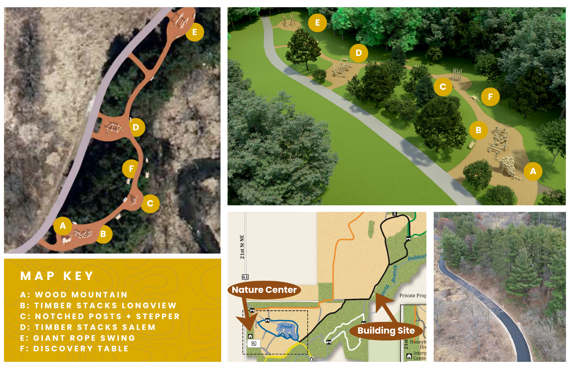 The playground will be located on Nature Center grounds in an area designed to connect play with existing trails and habitats. Several locations were evaluated to find the best fit while meeting required airport zoning regulations. Because of these restrictions, the playground could not be built directly next to the Nature Center building. Instead, it has been thoughtfully incorporated into the surrounding landscape just a few minutes’ walk from the Nature Center, creating a natural extension of the site’s educational and outdoor experience.