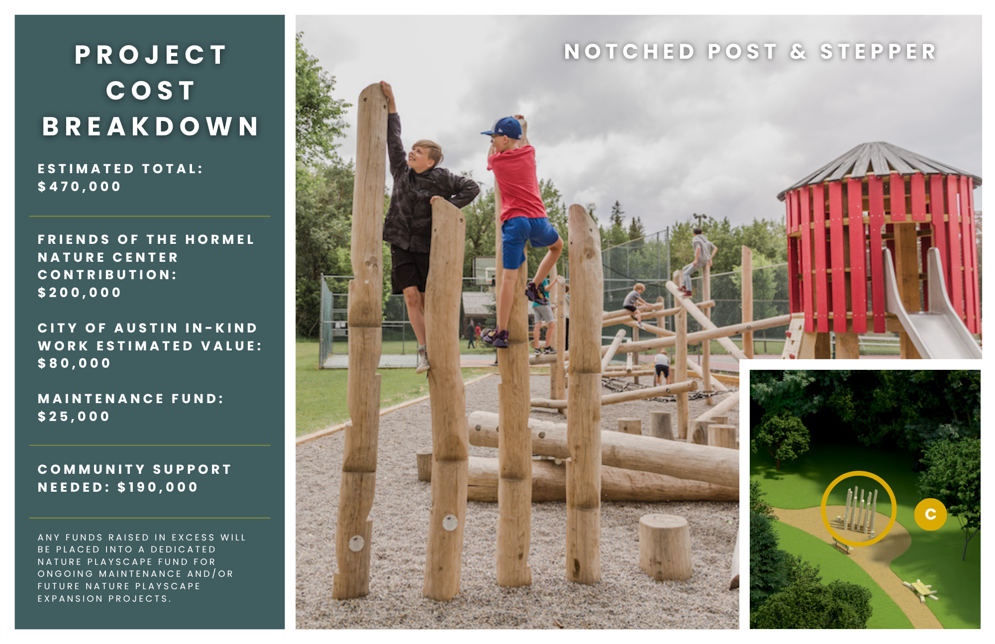 Modeled after similar nature-play facilities, including one in Rochester, the project’s cost is driven by the need for play features that are safe yet fun, age appropriate and created from materials that are durable to ensure many years of free enjoyment by the public.