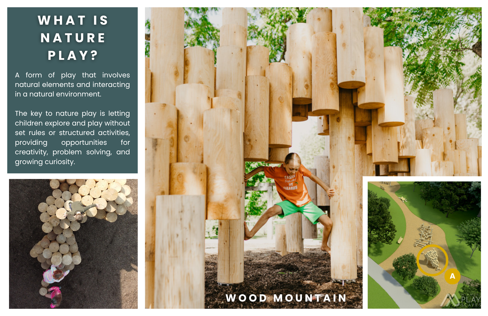 A nature-based play space designed to encourage imagination, movement, and connection to the outdoors through natural materials and creative, hands-on features.